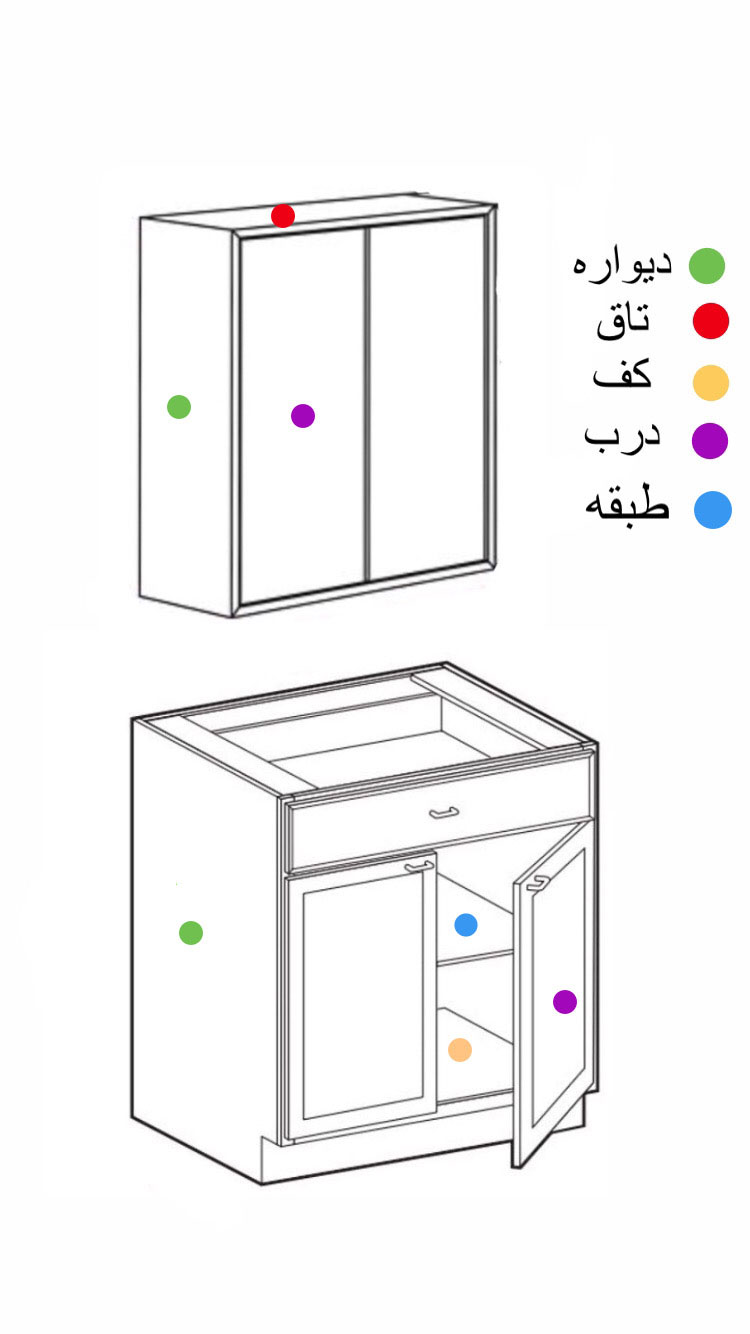 یک متر کابینت : همانطور که توضیح داده شد یک متر کابینت یعنی یک متر کابینت زمینی و یک متر کابینت هوائی که هر دو شامل دو عدد دیواره کناری، کف، تاق و درب میباشد